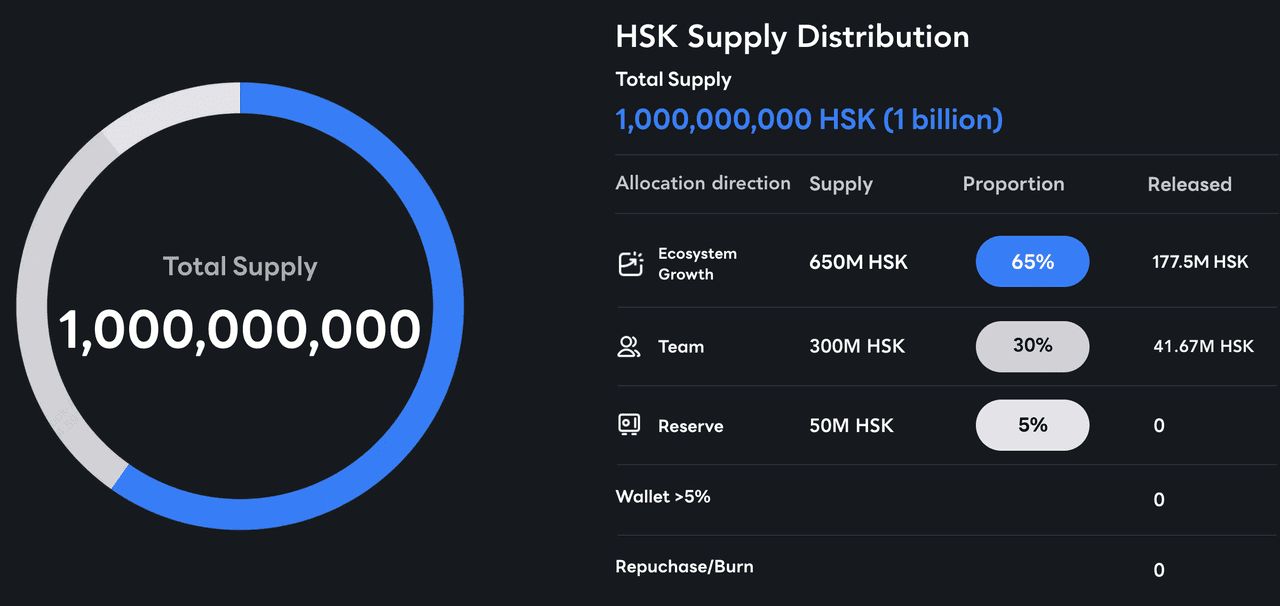 HSK 的总供应量为10 亿个代币,旨在支持长期的生态系统增长和平台的可持续性。分配模型简单透明,没有公开或私募代币销售。