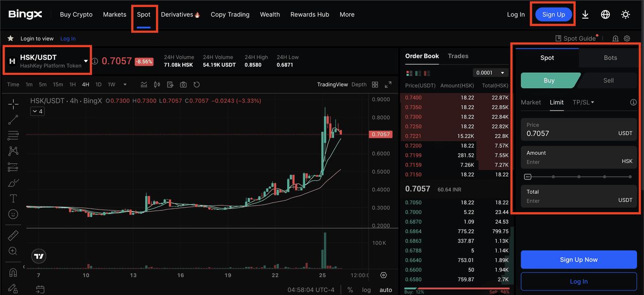 您可以直接在BingX现货市场使用HSK/USDT交易对购买HSK。
