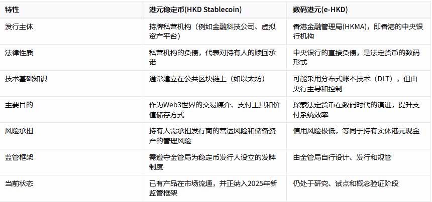 在探讨港元稳定币的同时,您可能也听说过另一个备受关注的概念——数码港元(e-HKD)。这两者都与港元和数码化有关,但它们的本质、发行方和角色定位有着天壤之别。混淆这两者,就像将商业银行的存款与中央银行发行的纸币混为一谈。为了更清晰地理解,我们可以通过一个表格来进行比较。