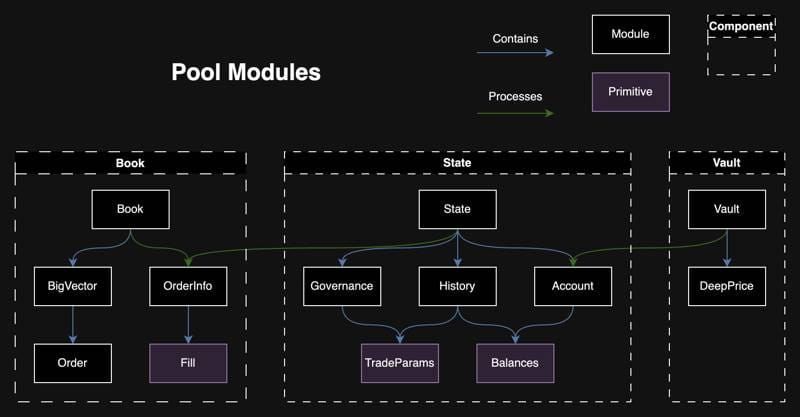 DeepBook 的运作模型基于共享对象池结构,包括三个主要组成部分: