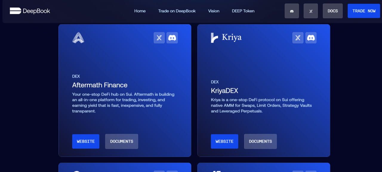 DeepBook 已与 Sui 生态系统中的 DEX 项目合作,如 Cetus Protocol、KriyaDEX、Aftermath Finance、Turbos Finance 和 Typus Finance。
