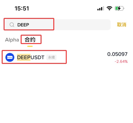 3、输入【DEEP】,这时下拉会显示合约DEEP USDT,点击【DEEPUSDT】。