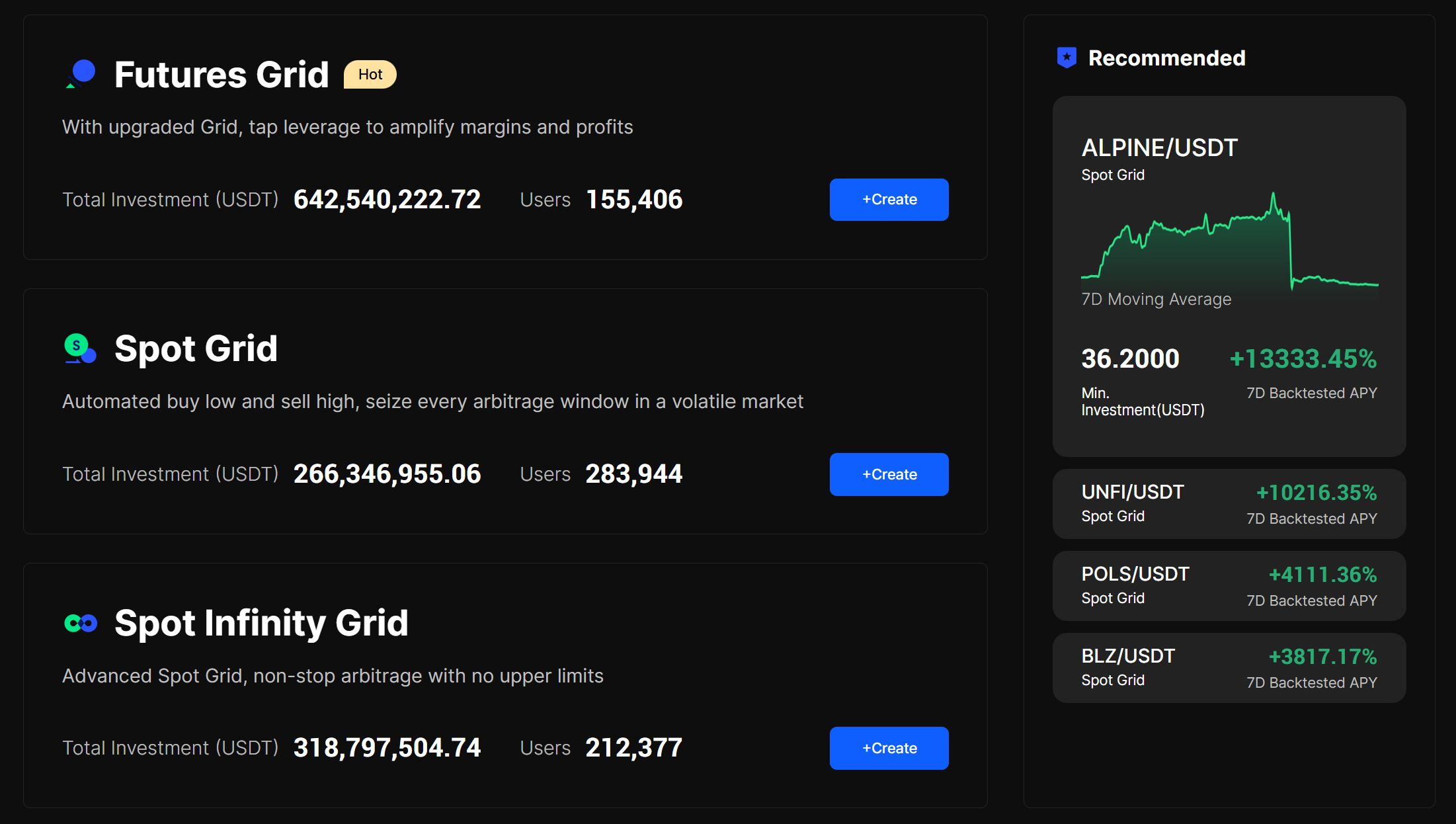 交易者可以使用 BingX 的交易机器人(称为“网格”)来自动交易,即使在睡觉时也能赚取利润。该平台提供丰富的现货和期货交易网格。期货网格拥有超过 27,000 名用户,投资额达 4160 万美元;现货网格拥有超过 160,000 名用户,投资额达 3980 万美元。