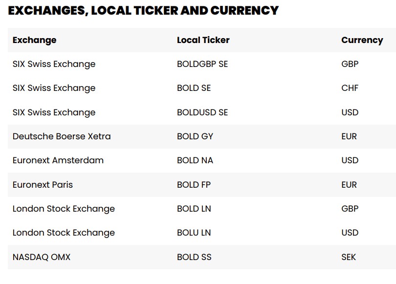 交易21Shares BOLD ETP的交易所、本地代码及币种。来源:21Shares