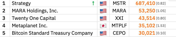 在比特币领域,由迈克尔·塞勒领导的Strategy公司继续遥遥领先于其他企业持有者,这得益于其于2020年率先开创了“比特币储备模式”。据BitcoinTreasuries.NET数据显示,该公司目前持有687,410枚BTC,远超排名第二的Mara Holdings Inc.(53,250枚BTC)和排名第三的Twenty One Capital(43,514枚BTC)。