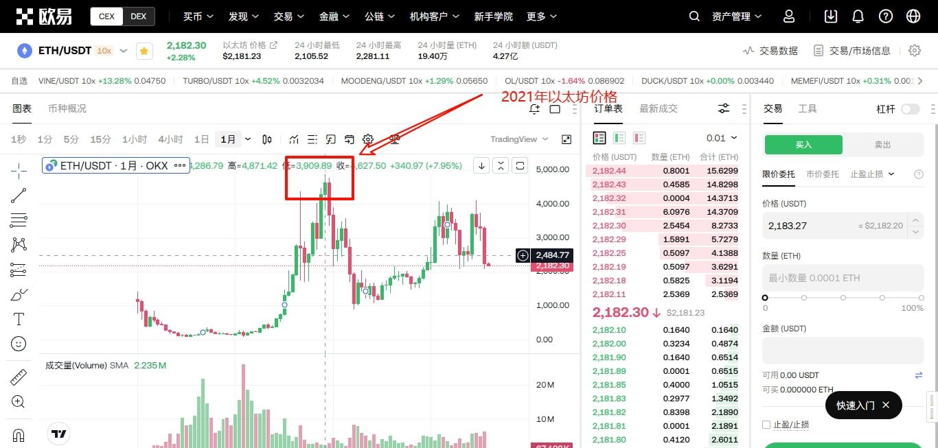 2021年:随着太坊网络的升级和挖矿的热潮,ETH价格在2021年迎来新一轮的上涨,最高曾接近4900美元。