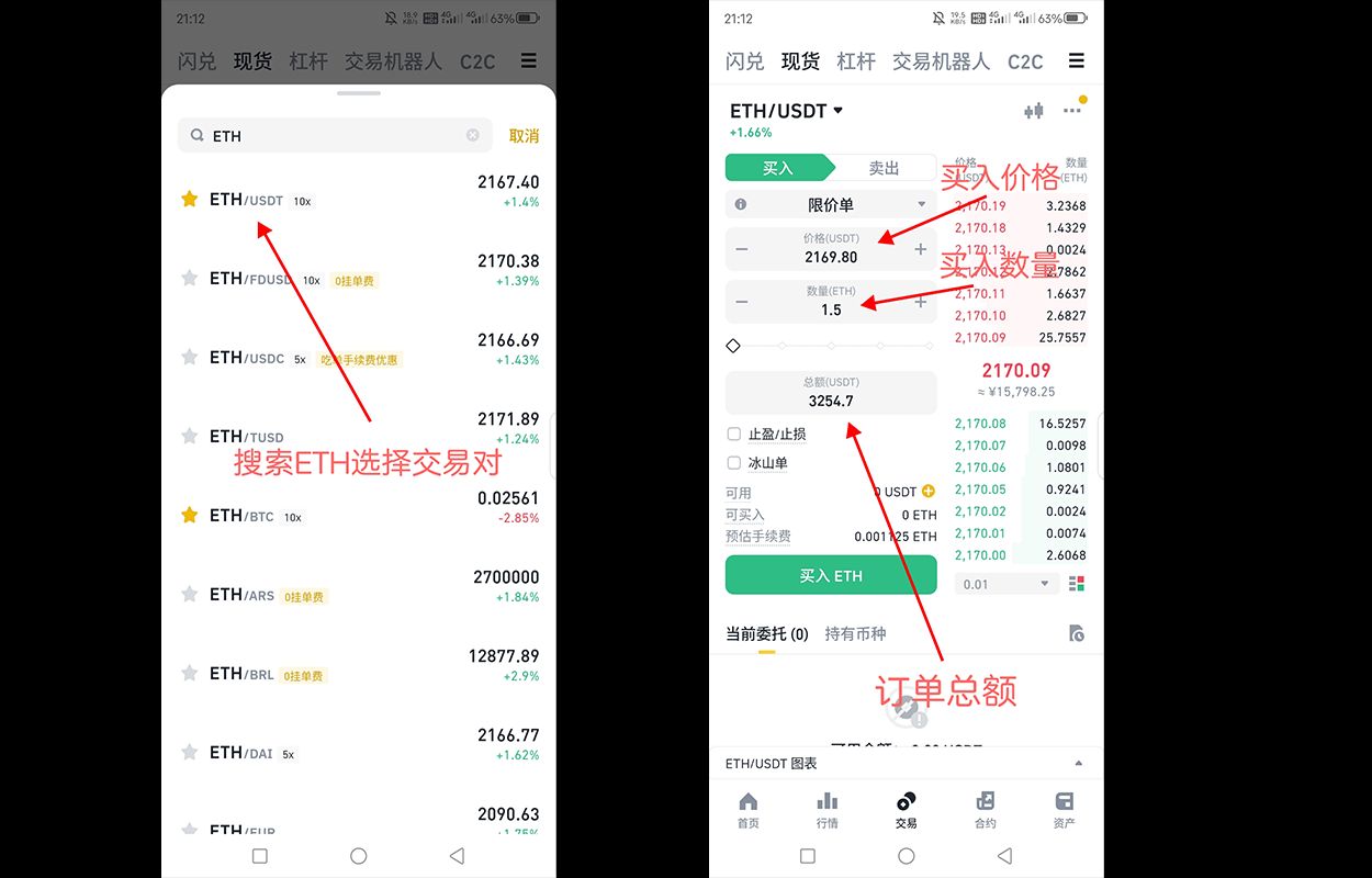 4、充值完成后,在交易>现货页面上选择ETH/USDT、ETH/BTC等交易对,输入您希望购买的ETH数量或金额,然后点击“买入”按钮。平台将会按照实时市场最优的价格为您匹配,完成交易。