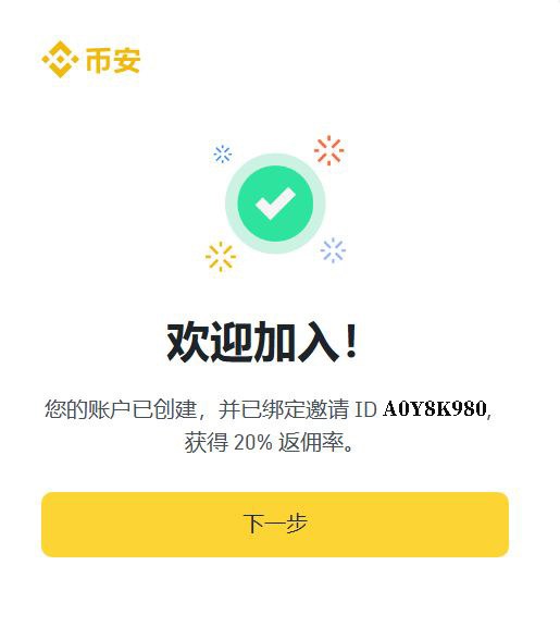 完成注册后确认绑定的邀请码 A0Y8K980 即可享受20%手续费返现。密码设置完成后即可完成注册