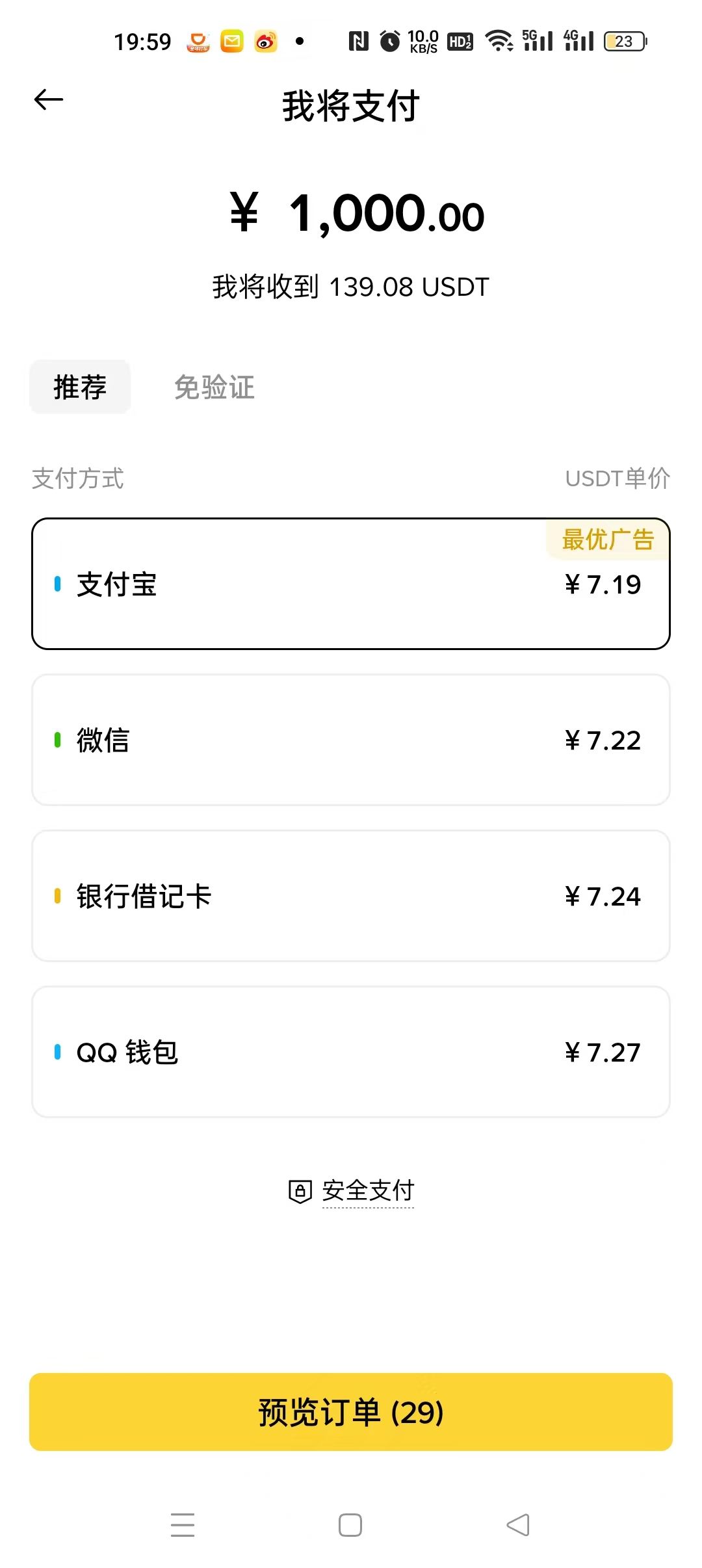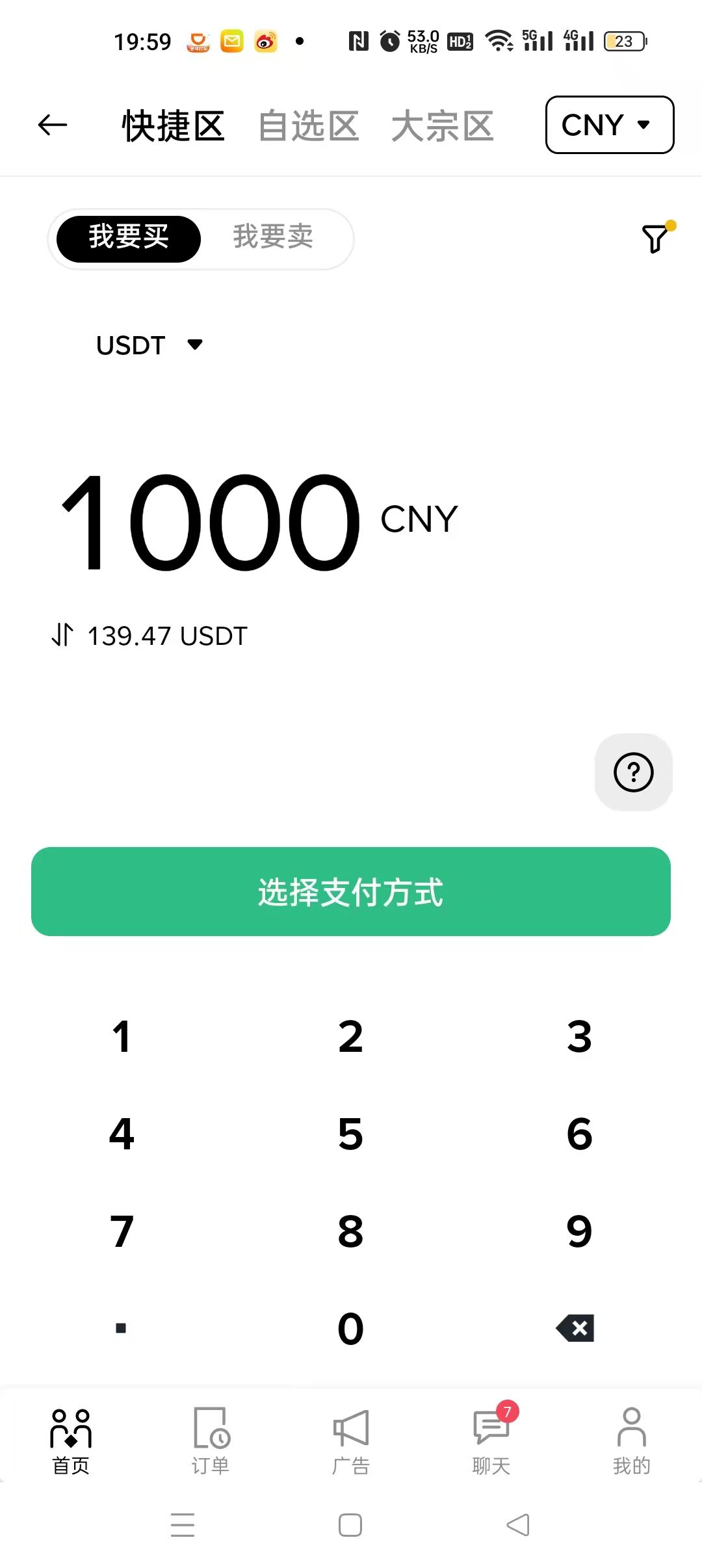 填写你要买入的金额,CNY指的是人民币,界面会有汇率说明,以下图为例,1000 人民币大概能购买139.47 USDT ,确定之后就选择支付方式,可以选择微信、支付宝或者银行卡的方式付款,不同的支付方式的汇率都会有差别,金额小无所谓,金额较大的话,尽可能在自选区选择汇率更好的商家。