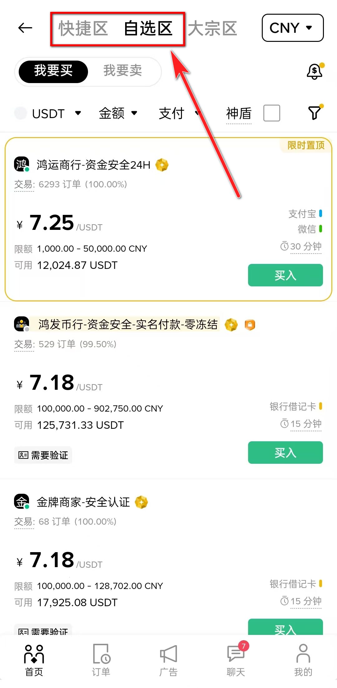 2、进入买币页面,会有自选区与快捷区两个选项。