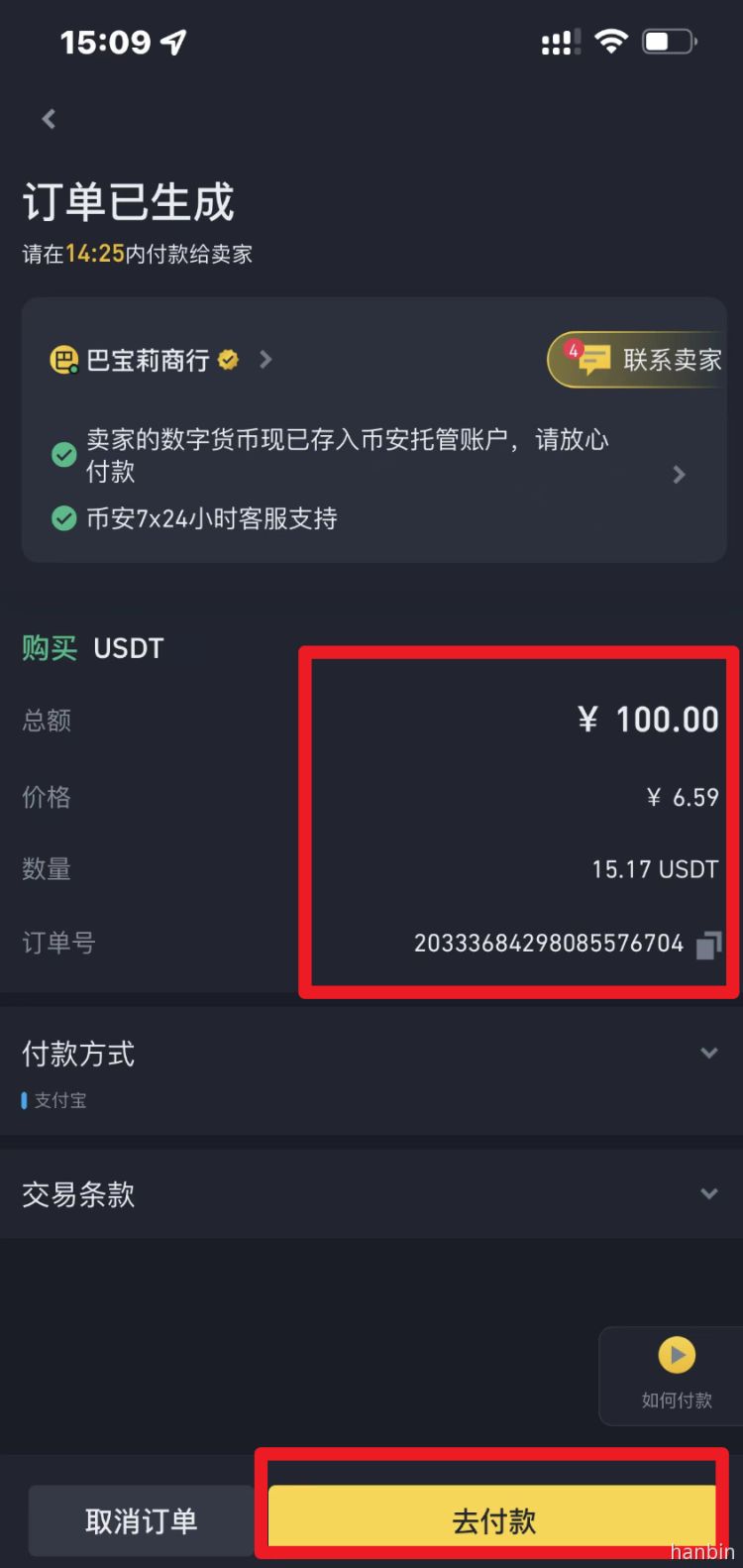 来到付款页面,(如有要求绑定手机号,则正常绑定自己的手机号即可)根据卖家选择的付款方式进行人民币转帐,因为这里购买金额较小,所以以支付宝为例子。(大额一般都是银行卡转账,且商家会要求你提供该卡近3天以上的流水,这是正常的,在手机银行的app里截图发给商家即可)