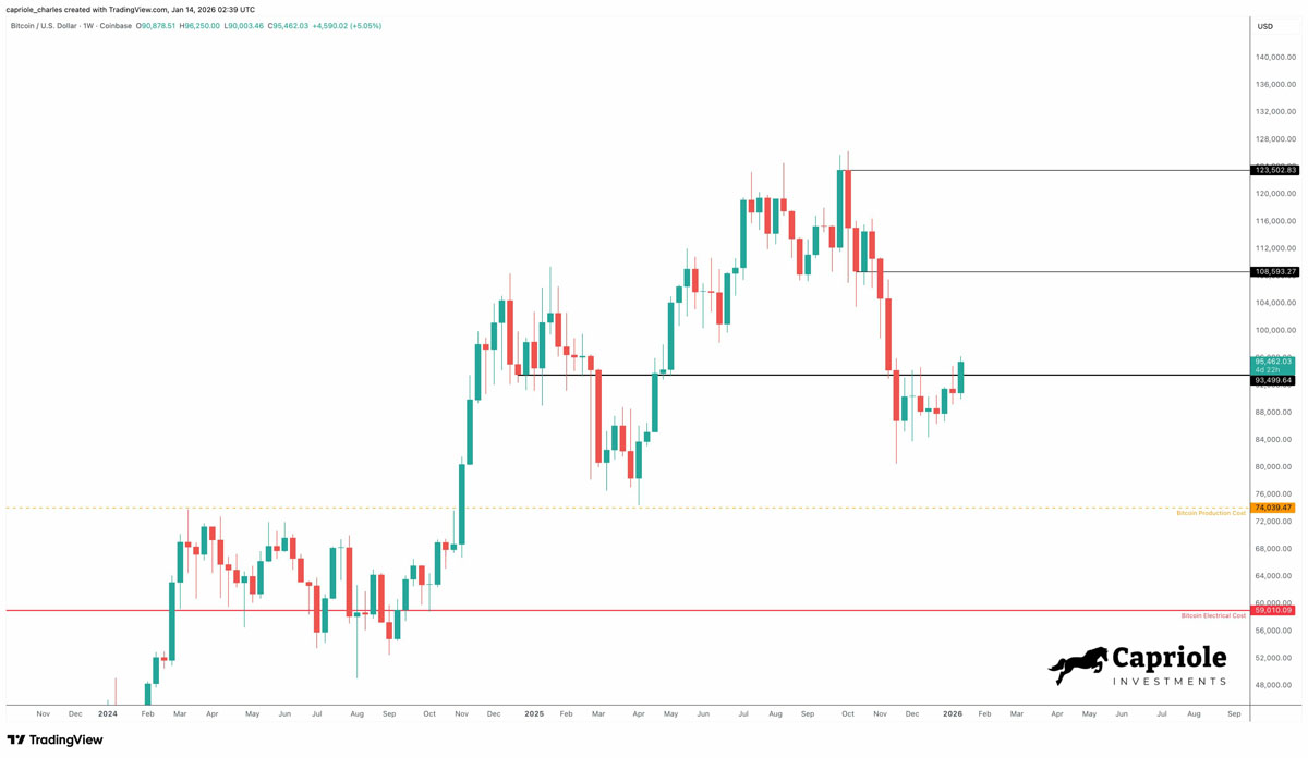 爱德华兹指出,比特币日线收盘价已突破2025年全年开盘价水平,位于约93,500美元附近——这是自1月6日以来的首次。