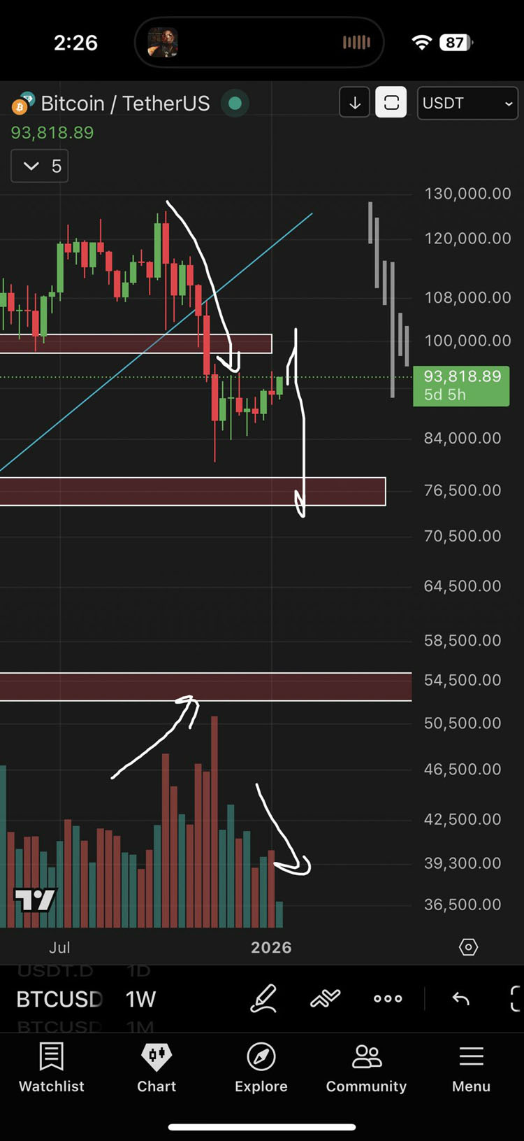 “这是教科书般的看跌价格走势:成交量上升,价格下跌,随后成交量下降,价格回升或横盘整理,”他在周线图中写道。