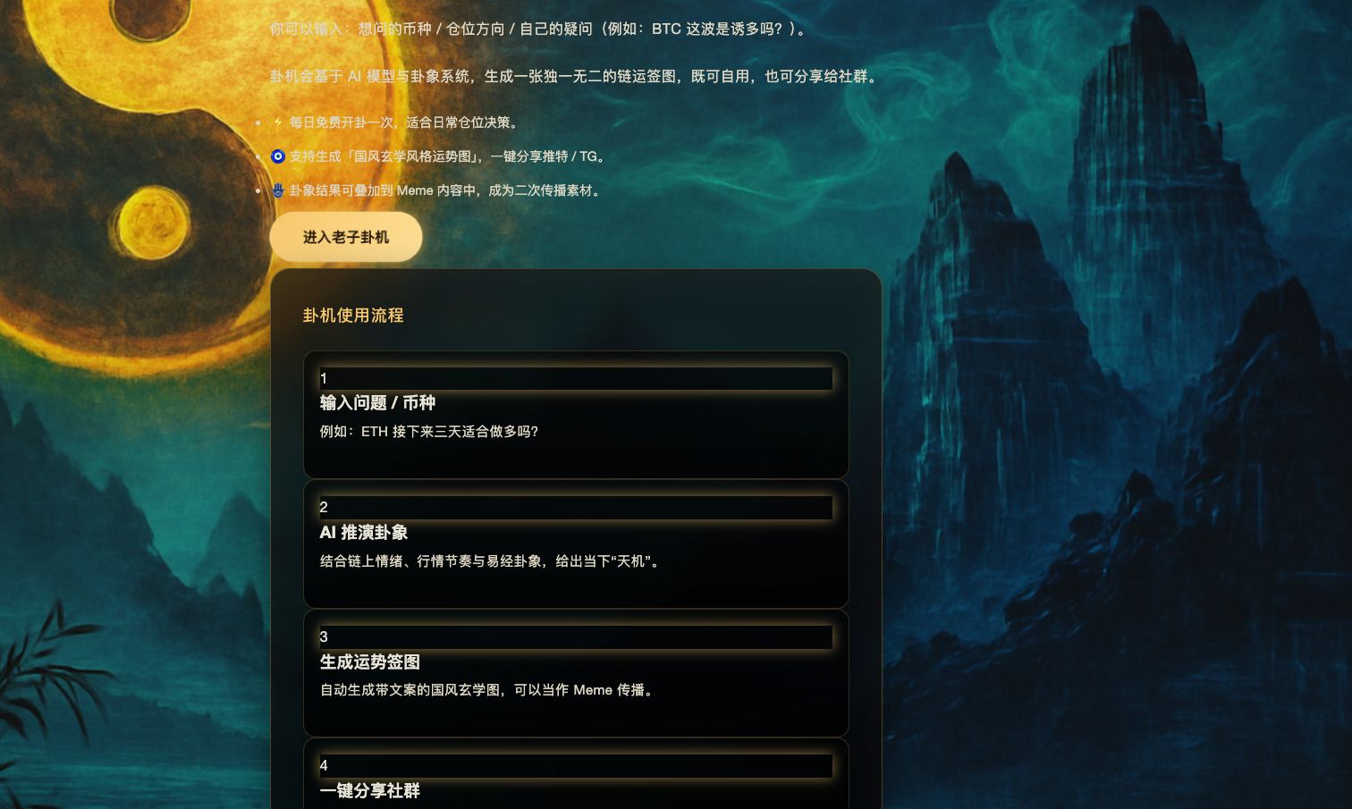 - “卦机”和“神签”工具:老子预言机概念融合了 AI、《易经》图案和链上数据,生成可在社交平台分享的财富图像和标题,支持迷因传播。
