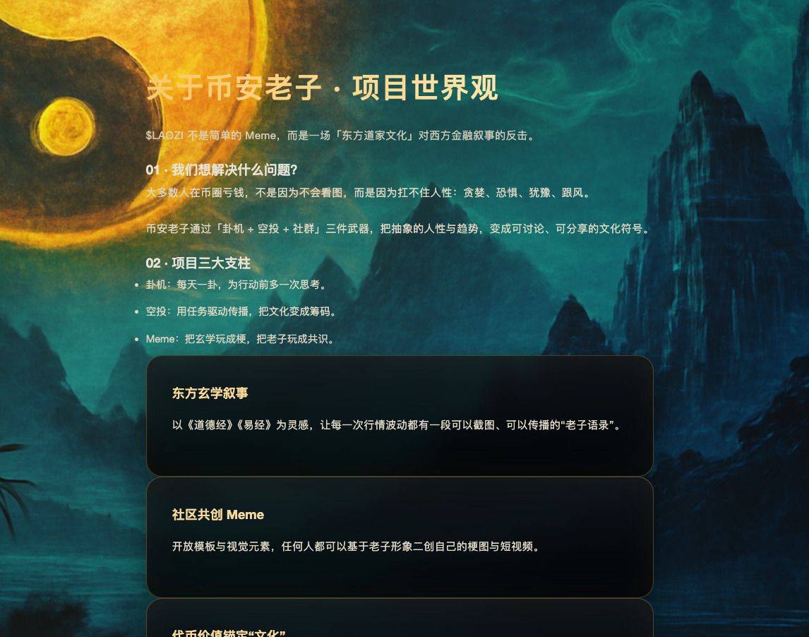 从技术角度来看,LAOZI 是 BNB 智能链上的标准 BEP-20 代币,合约地址为 0x1a5f9d77ca46646cd4937fd8d093f460b66f4444,已由 CoinMarketCap 和链上扫描仪确认。官方网站上描述的更广泛的“币安老子”生态包括一个受 AI 和《易经》启发的“卦机”预言机,它生成风格化的财富图像和语录,将活动市场情绪和持仓转化为可分享的文化产物,尽管这些工具主要侧重于叙事和内容,而非内核协议基础设施。
