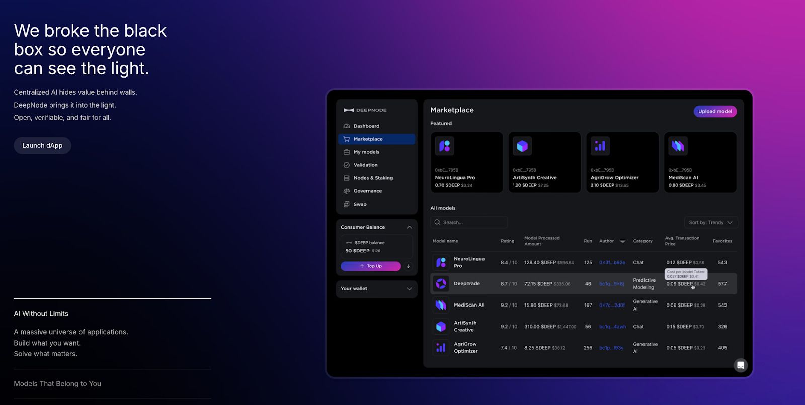- 人工智能基础设施重点:DeepNode 将自己定位为开放智能的基础设施,通过链上激励连接人工智能模型提供商、验证者和消费者。