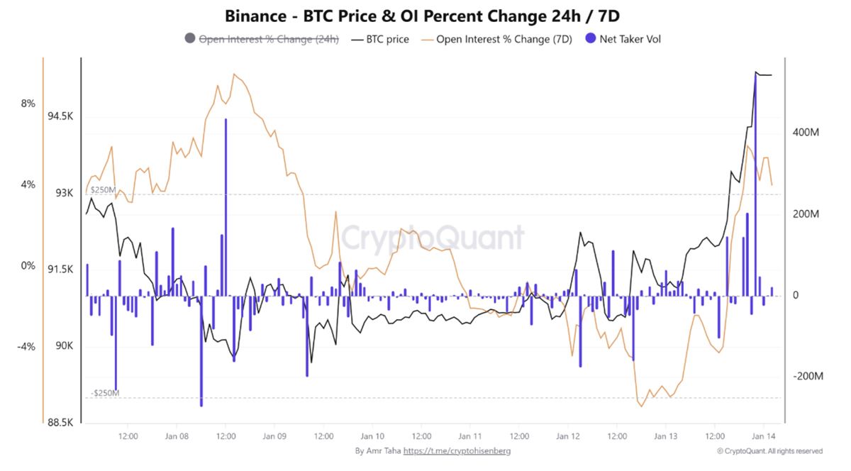 衍生品数据进一步强化了这一观点。加密分析师Amr Taha指出,币安净吸收量出现大幅扩张,单个小时蜡烛图显示超过5亿美元的积极市场买入行为。
