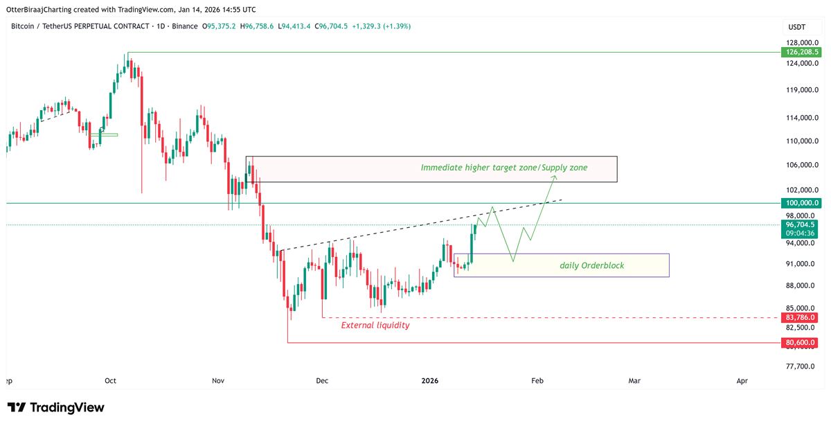 比特币年初的复苏势头持续至1月第二周,这一加密货币在9.6万美元上方创下2026年新高。此次上涨确立了新的更高高点结构,这一走势被技术分析师解读为明确的看涨信号。