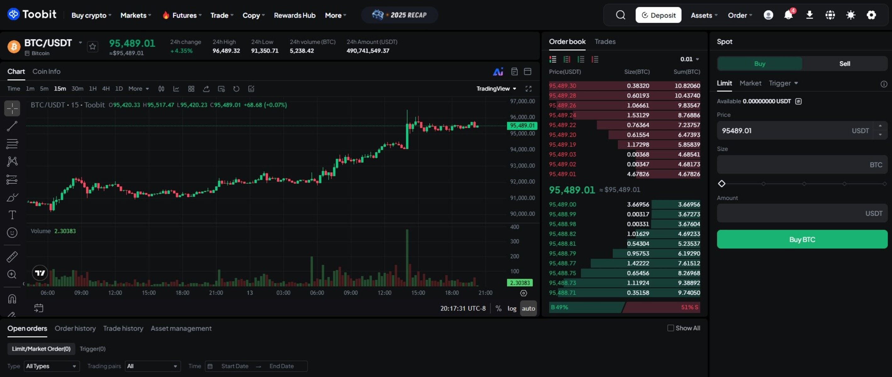 Toobit 的交易流程简单明了,结构清晰。用户可以下单现货、期货合约、跟单交易,或使用交易机器人实现策略自动化。界面实时显示图表、订单簿和账户余额,帮助用户做出明智的决策。
