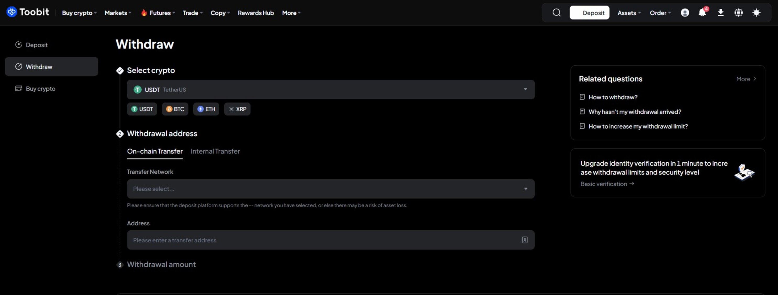- Toobit 交易所的加密货币充值是免费的;同时,提现取决于网络状况,KYC 等级决定了提现限额。