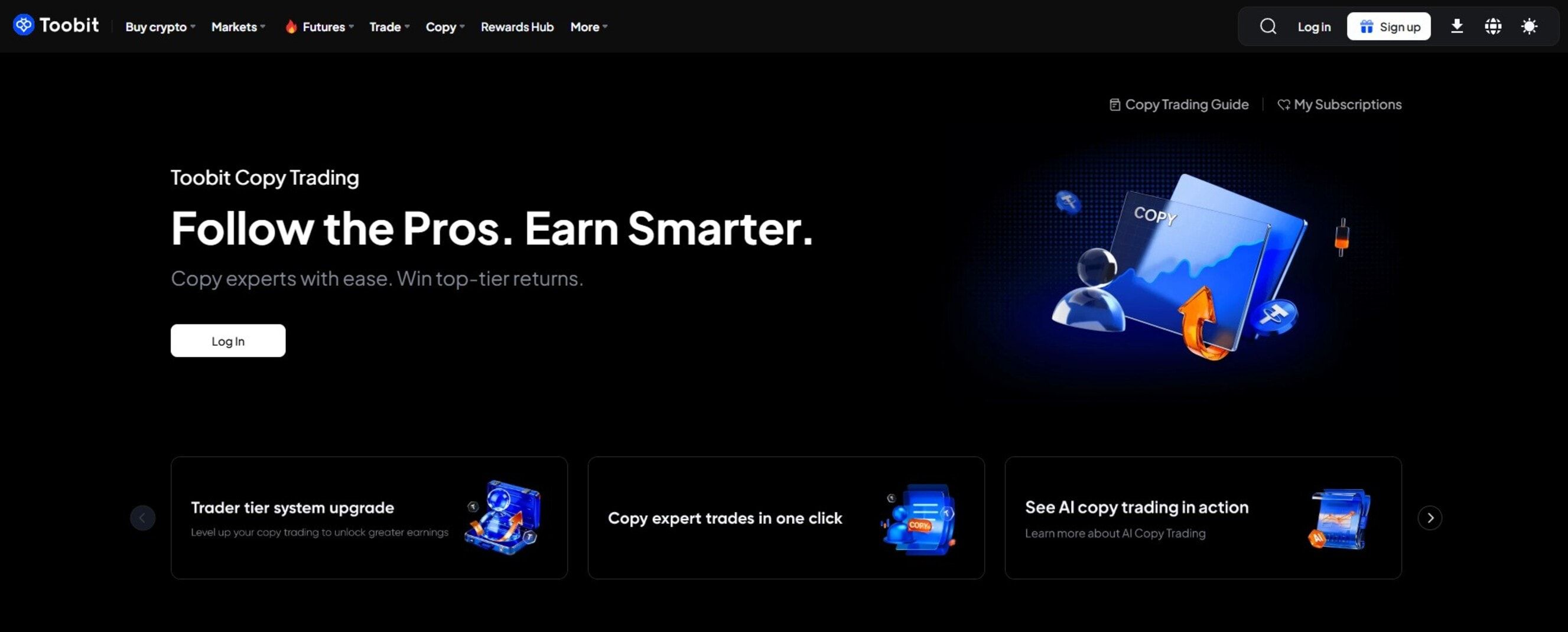 - Toobit 是一个功能全面的加密货币交易所,为交易者提供现货和期货市场、跟单交易、自动机器人和质押等服务。