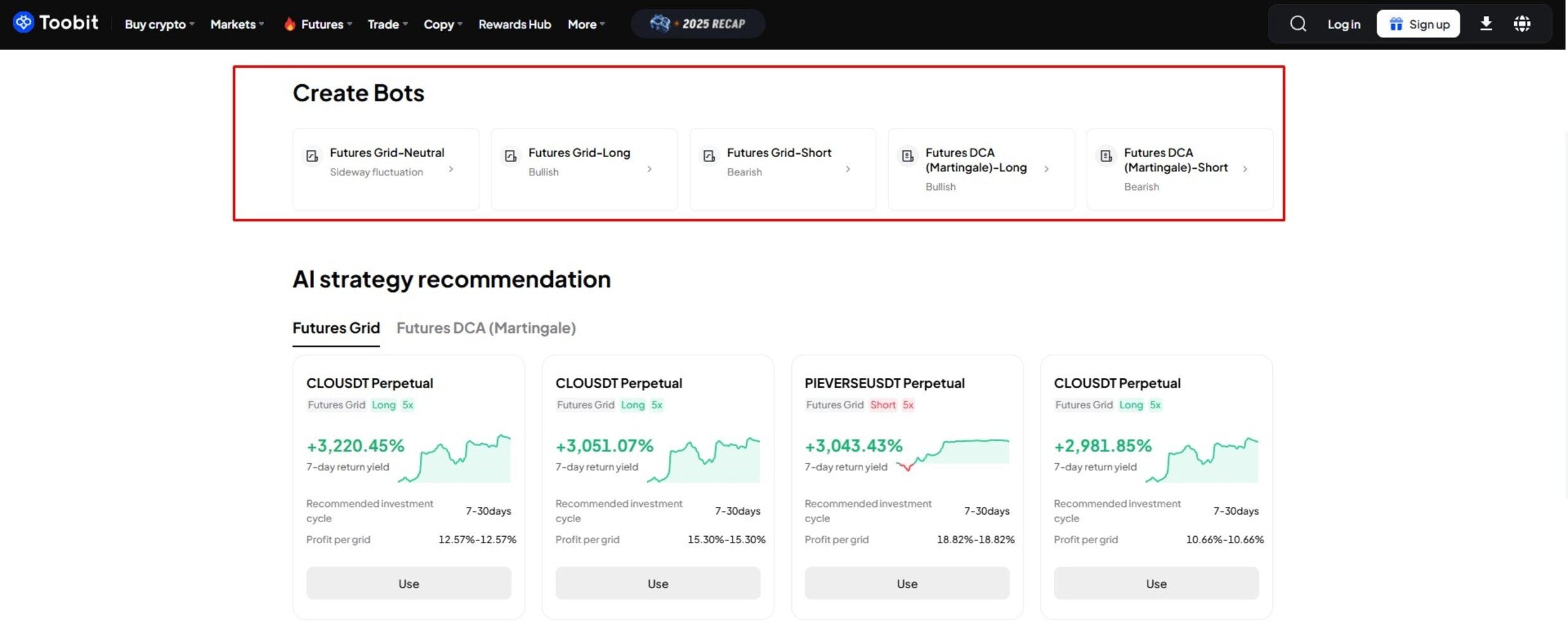 除了手动交易和跟单交易外,Toobit 还支持自动交易工具/机器人,帮助用户全天候执行预定义的策略。