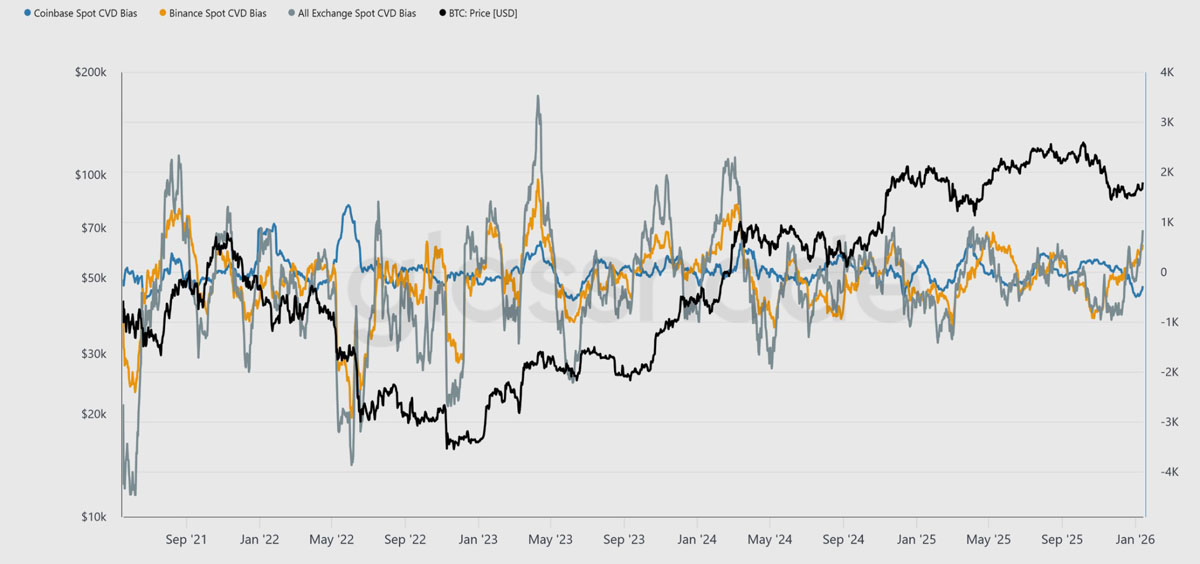 下图显示,比特币现货市场活动已开始改善,其中币安与各交易所累计成交量差(CVD)指标已重回买方主导的态势。