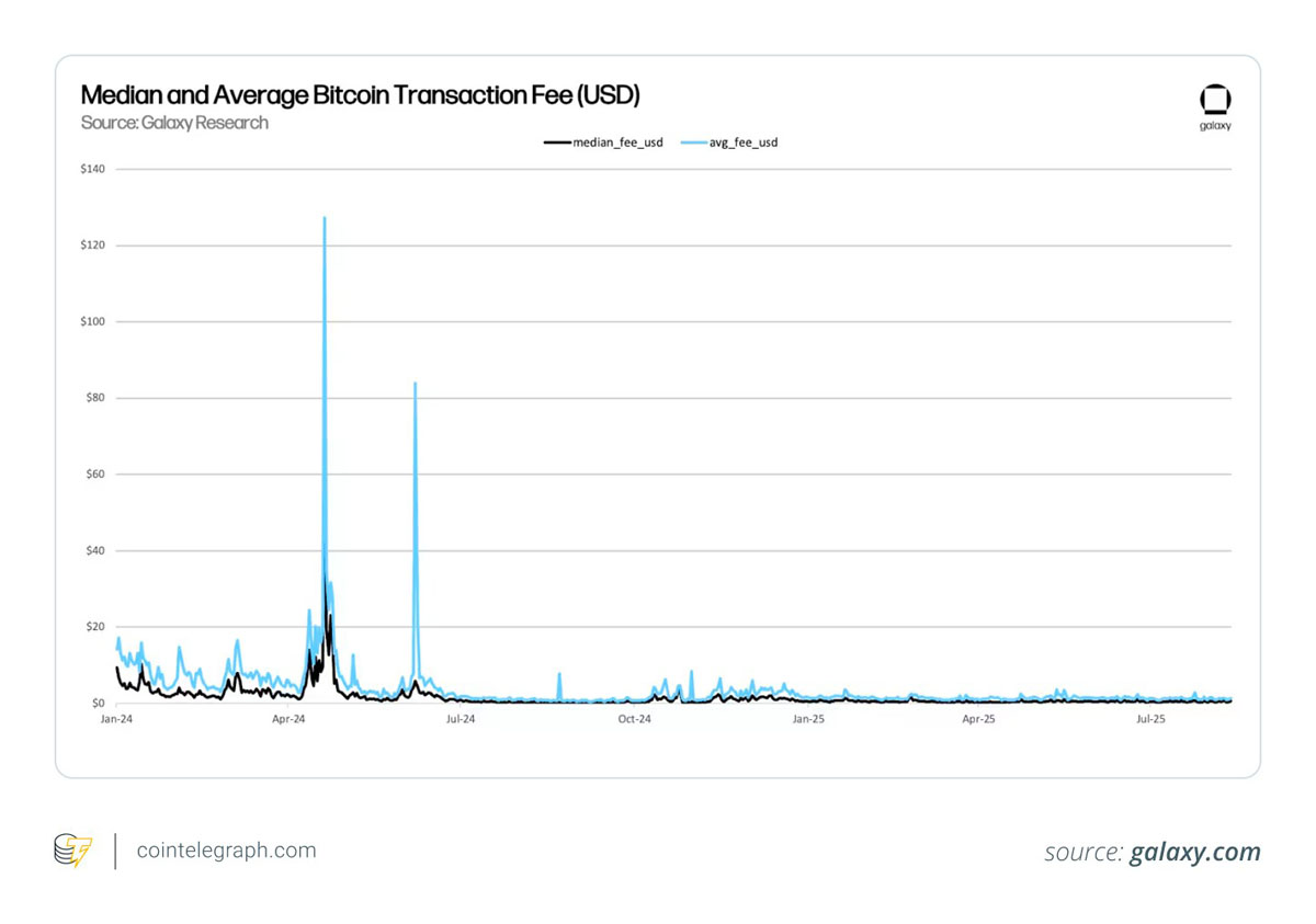 CoinShares从挖矿方的角度提出了同样的观点,称交易费用“已降至历史最低水平”,在2025年部分时段甚至低至“占区块奖励总额的不到1%”。