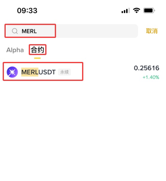 3、输入【MERL】,这时下拉会显示合约MERL USDT,点击【MERLUSDT】。