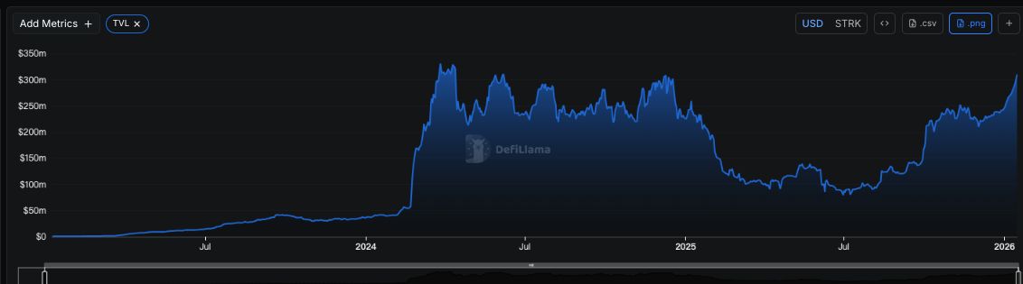 但经过一年多时间的卧薪尝胆,Starknet 现在已经能和大多数 L1 掰掰手腕。据 DeFiLlama 数据,Starknet 的 TVL 自 2025 年 9 月开始回升,目前已超 3 亿美元,回到了 2024 年的水平。在区块链排名上位列第 22,超过了 Monad、Scroll、Linea、Sei 等一众 L1 和 L2。