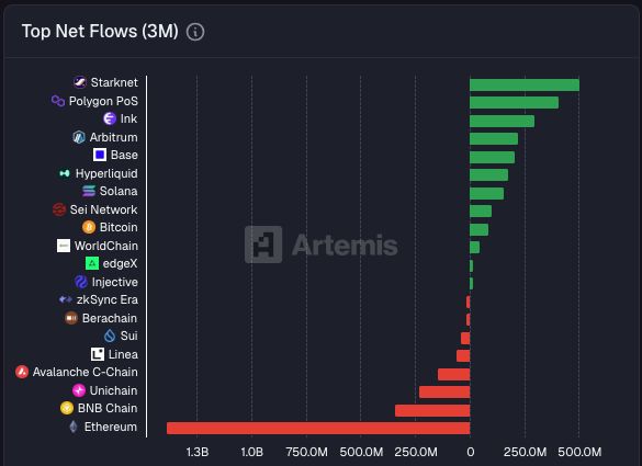 不要简单地把 Starknet 视作区块链中“小众爱好者”的聚集地,事实上,Starknet 已获得了外部资金青睐,并且留存度较高。据 Artemis 数据,Starknet 3 个月资金净流入量达 5.042 亿美元,位居区块链榜首,第二名 Polygon 与其相差 1 亿美元,远远甩开了 Solana 和 BSC 等区块链。