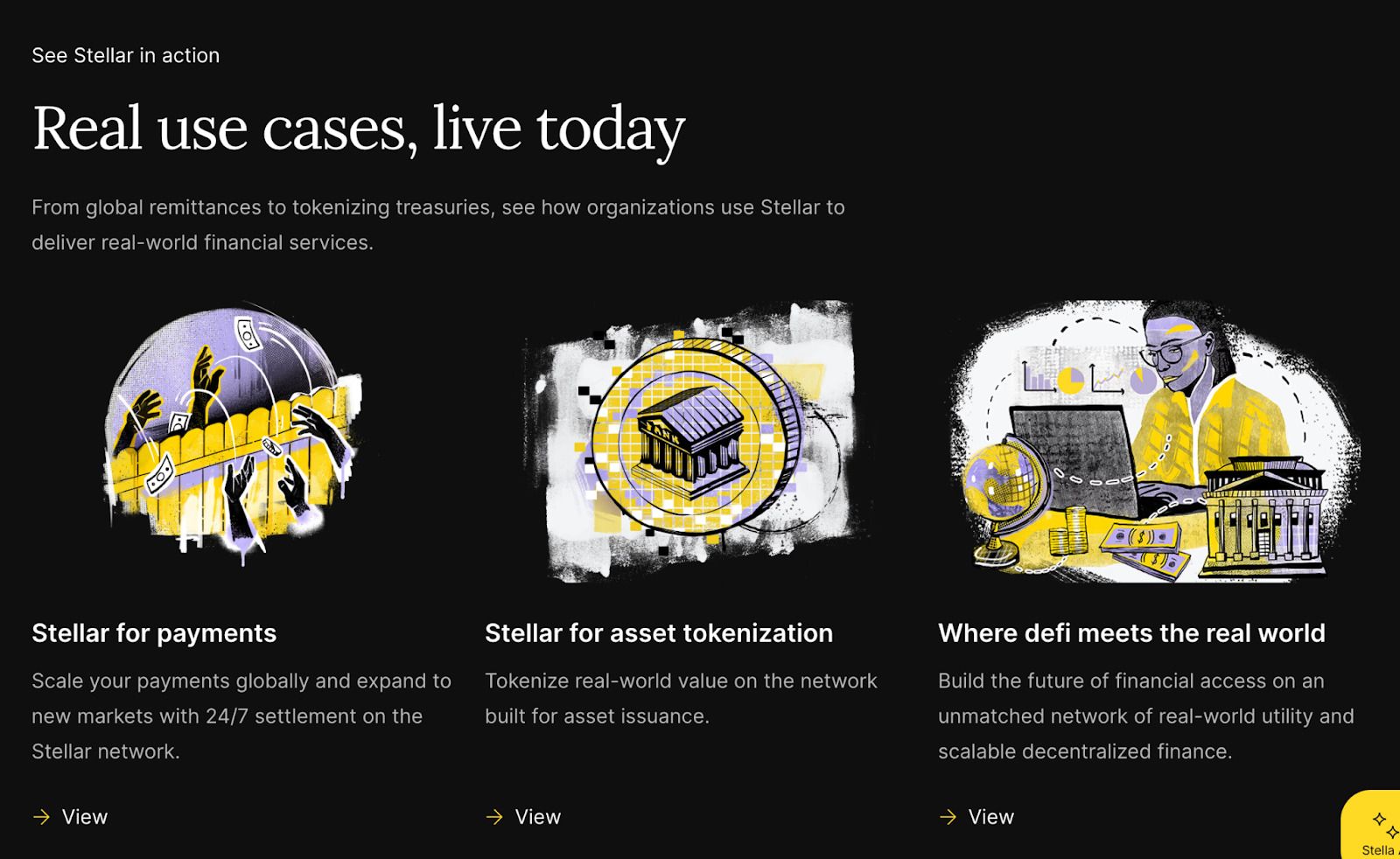 Stellar 主要属于支付和汇款类别,提供基于区块链的替代传统代理银行和汇款服务。它还通过提供发行和结算法定货币及其他金融工具的数字表示的基础设施,与稳定币和代币化资产重叠。