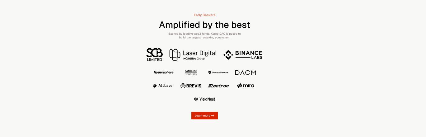 2024 年 11 月,KernelDAO 完成 1000 万美元融资。本轮融资由 Binance Labs 领投,参投机构包括:SCB Limited、Laser Digital、Bankless Ventures、Hypersphere Ventures、Cypher Capital Group、Draper Dragon、ArkStream Capital、Digital Asset Capital Management、HTX Ventures、Avid VC、GSR、Cluster Capital、Longhash Ventures、ViaBTC Capital、Side Door Ventures、NOIA Capital 以及 DWF Labs 等知名投资方。