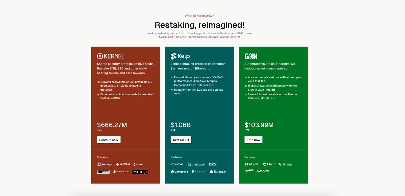 Kernel DAO 支持三个主要协议:Kernel(在 BNB Chain 上进行再质押)、Kelp Liquid Restaking(rsETH)和 Gain(自动化回报农耕)。每个协议都在优化资产运用和质押收益方面发挥独特作用。