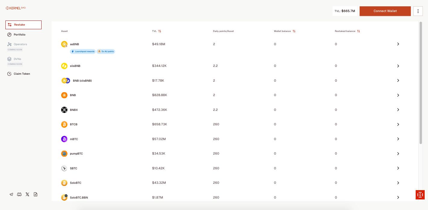 - Kernel 协议:这是 Kernel DAO 的内核协议,让用户能够再质押像 BNB 和 BTC 等资产,提升安全性与回报。这一协议的跨平台集成确保用户可以在不牺牲安全性的情况下优化回报。