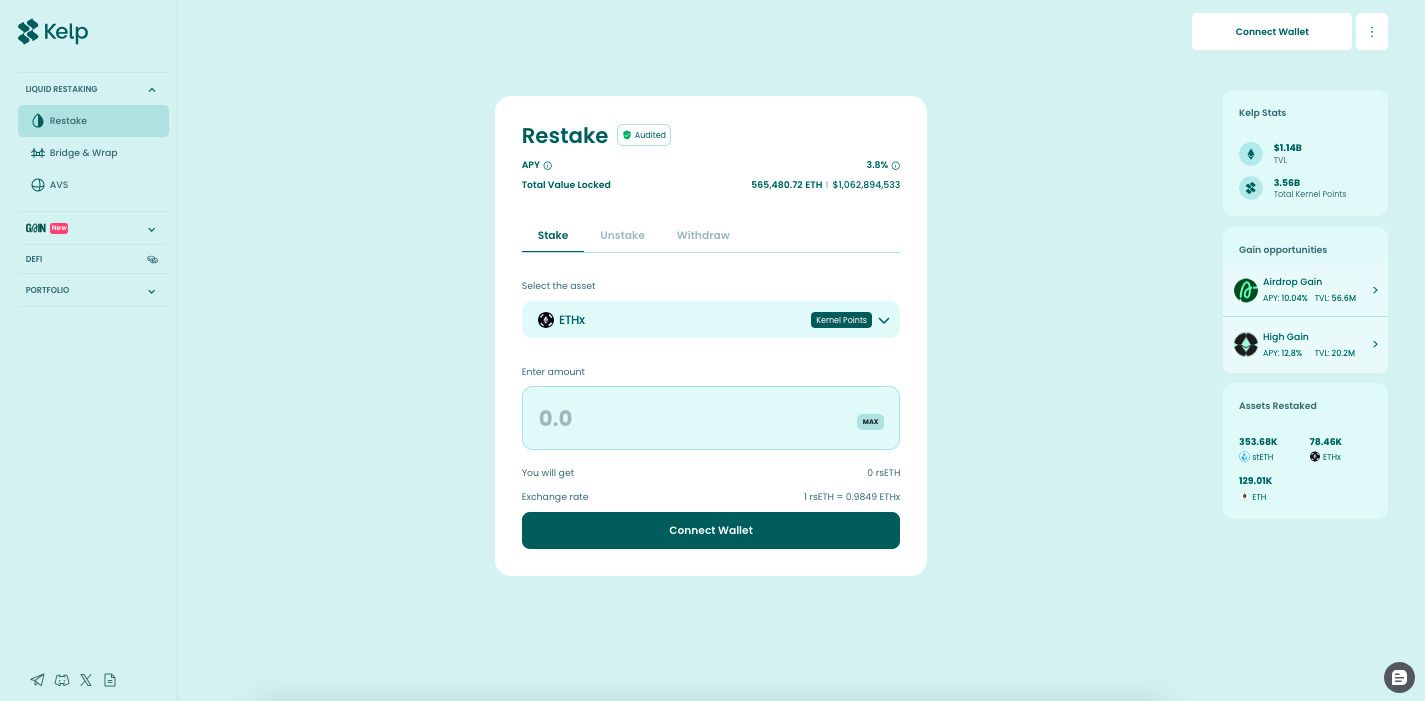 该平台由三个主要组件组成:Kernel、Kelp 和 Gain。Kernel 是基础设施层,支持在 BNB 智能链及 BTC 相关网络的再质押;Kelp 是面向以太坊的多链流动性再质押解决方案;Gain 则提供 ETH 与流动性代币的自动化质押金库,通过策略优化帮助用户提高收益率。三个模块协同运作,共同提升质押效率与安全分布。