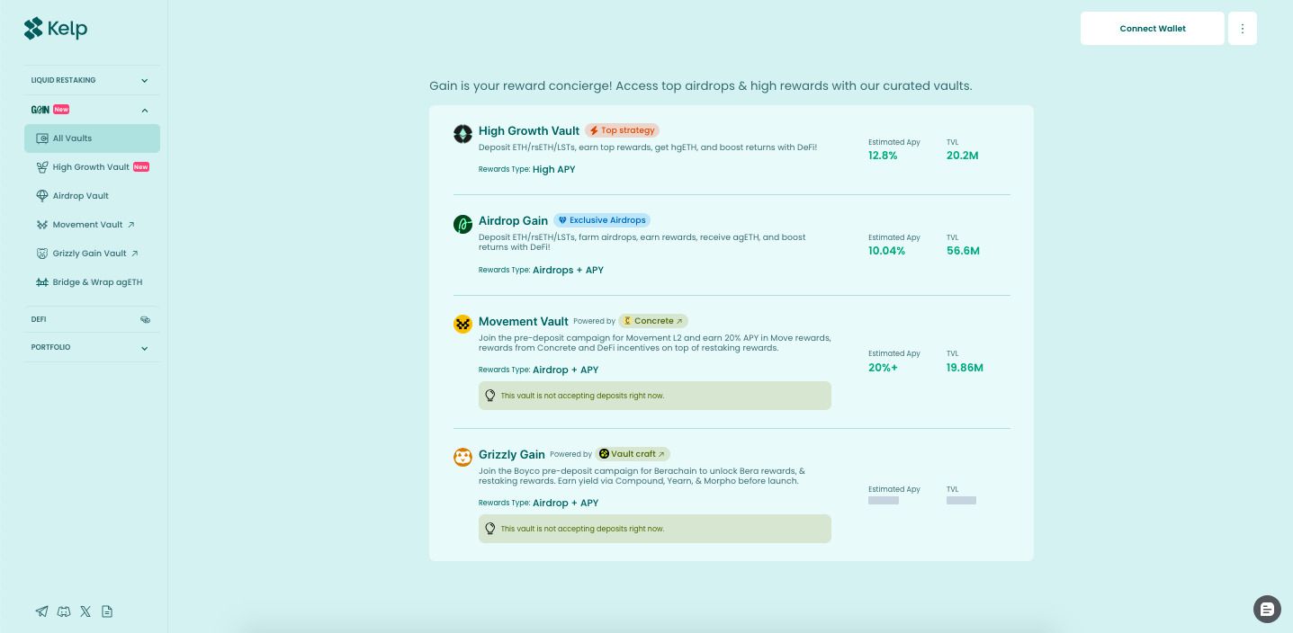Gain 是一个基于金库(Vault)的系统,旨在为用户提供结构化的方式,通过 ETH 及其他高流动性资产获取收益。该系统将质押、流动性激励与空投奖励集成于同一平台,帮助用户最大化收益。不像传统的单一质押池,Gain 通过自动化策略在多种来源之间分配奖励,从而优化收益。