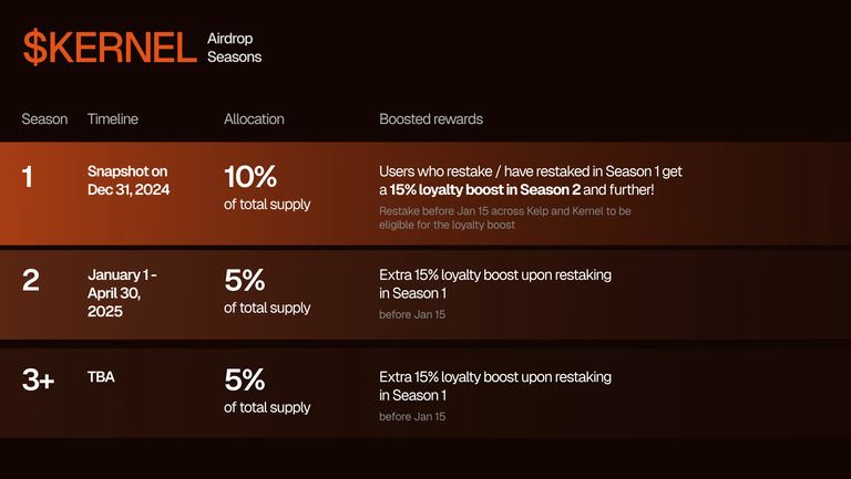 - 第 1 赛季(2024 年 12 月 31 日快照):10% 的 KERNEL 将分发给符合条件的用户。在此期间再质押者将获得后续赛季的 15% 忠诚度加成。需在 2025 年 1 月 15 日前于 Kelp 和 Kernel 平台 完成再质押。