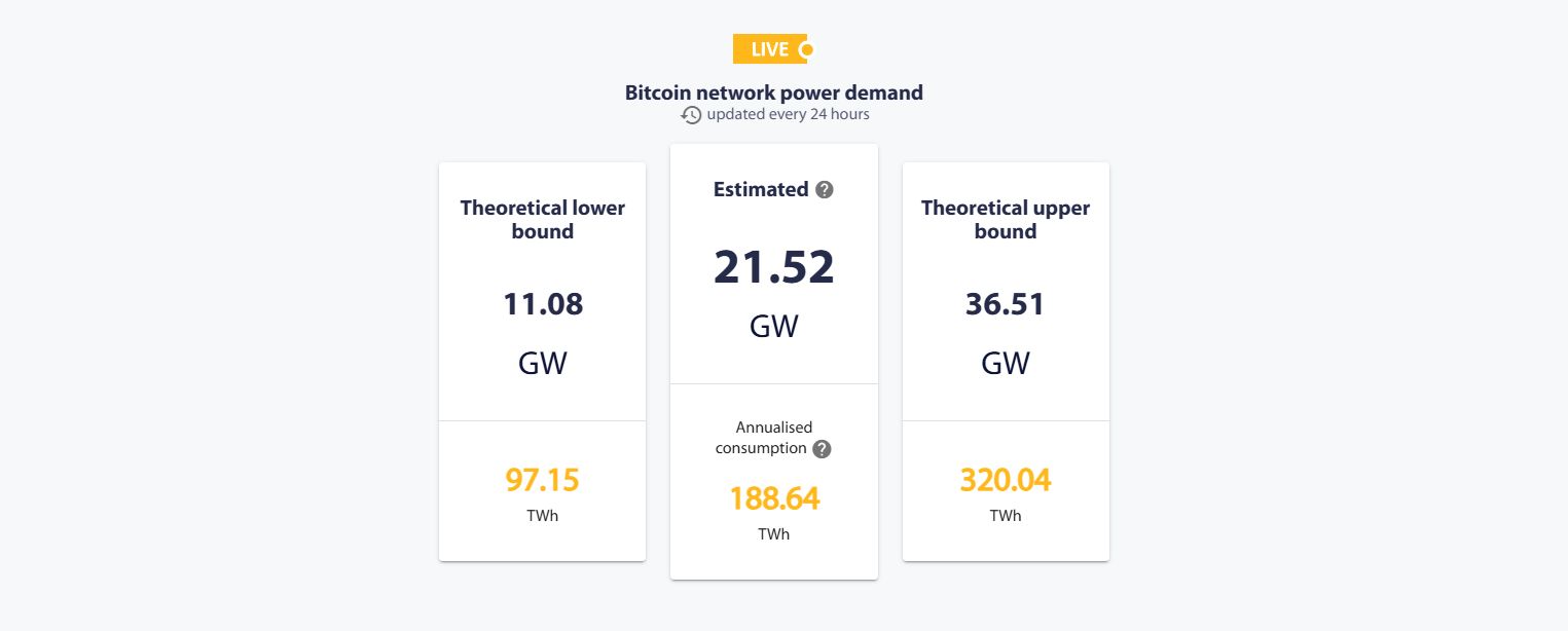 比特币挖矿需要消耗大量的电力和计算资源来驱动专用设备。根据剑桥比特币电力消耗指数,比特币网络的年化耗电量为 188.64 太瓦时 (TWh)。其硬件能效介于 11 至 30.50 焦耳/太赫兹 (J/TH) 之间。这些数据反映了挖矿产生的巨大碳足迹。