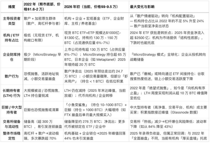 2026 年初与 2022 年相比,比特币投资者结构的最大差异在于:市场已从「散户主导、高杠杆投机」转向「机构主导、结构性长期持有」。