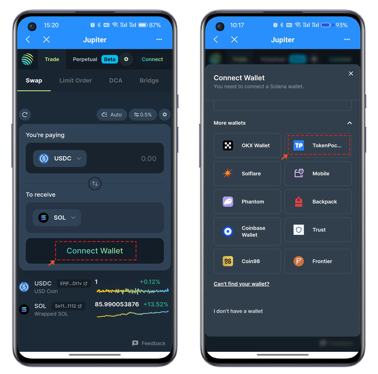 二、打开Jupiter后首次使用需要点击【Connect Wallet】,在列表中选择【TokenPocket】的方式连接钱包。