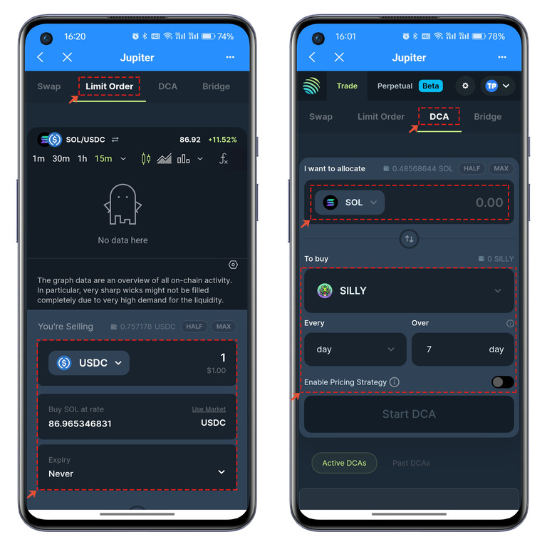 四、Jupiter中的【Limit Order】是限价单功能,意味着可以通过这里来根据自己预想的价格进行挂单处理,感兴趣的用户可以深入了解一下这个功能。【DCA】也属于Jupiter中比较特别的功能,可以选择不同的代币执行不同时间的代币操作。