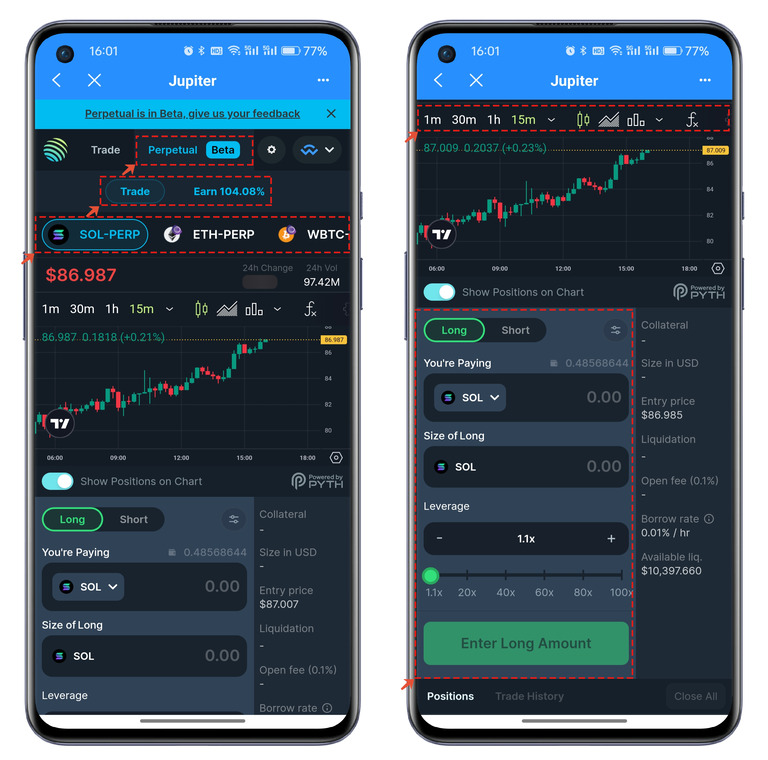 五、Perpetual 功能暂时处于测试阶段,可以根据不同的代币流动池的价格走势来进行杠杆的操作。