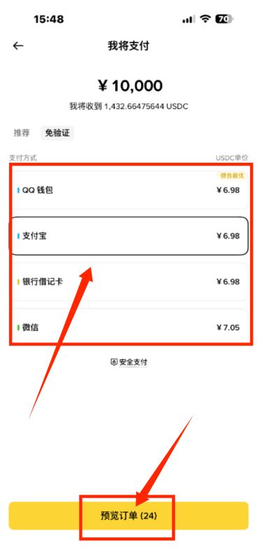 填写你要买入的金额,CNY指的是人民币,界面会有汇率说明,以下图为例,1000 人民币大概能购买139.47 USDT ,确定之后就选择支付方式,可以选择微信、支付宝或者银行卡的方式付款,不同的支付方式的汇率都会有差别,金额小无所谓,金额较大的话,尽可能在自选区选择汇率更好的商家。