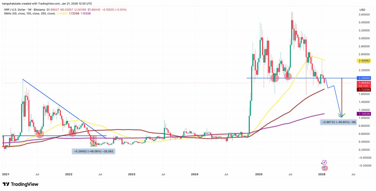 如果历史重演,若1.80美元至2美元区间支撑未能守住,XRP或将跌至最低1.40美元。