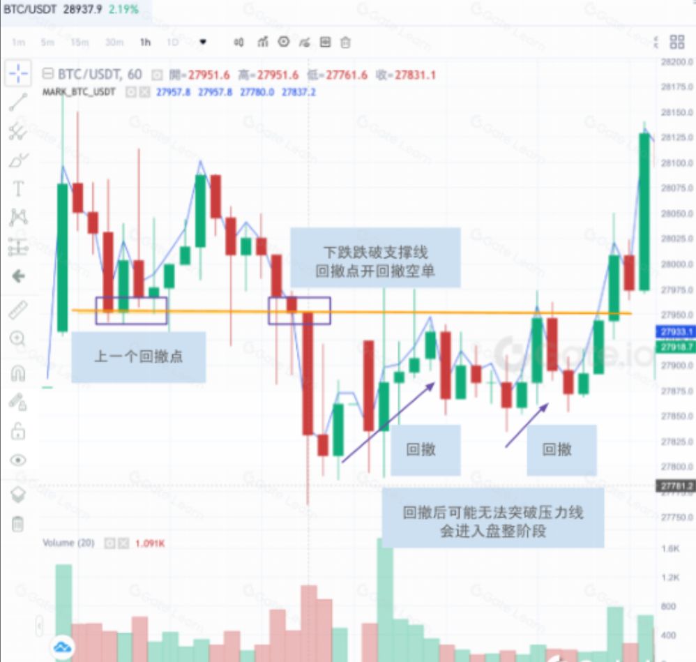 当价格反转之后未表现明显趋势,反而呈现横盘的走势,此时可以在上一个上涨前的回撤点位设置空单。如果价格来到上一个回撤点后,攀升反转后回落至阻力线,可能会跌破支撑线。若事先以回撤点价格挂下空单则可以获利。但是也存在价格回到回撤点后没有跌破支撑线的可能性,因此这种基于价格走势预测的交易手法风险较高,需要谨慎考虑。