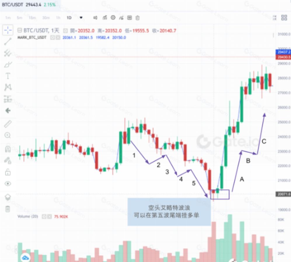 由第 3 段最低点( 22314 美元)开始挂空单直到走出第 5 段最低点 ( 19611 美元),而在第 5 段尾挂出多单等待艾略特的上升反弹波浪。若由第 3 段挂空单可以获利 2703 美元( 22314 - 19611 美元),另外在第 5 段最低点的设置的多单,则在进入盘整前获利可来到 27719 美元,获利 8108 美元( 27719 - 19611 美元),从 2023 年 3 月 3 日至 3 月 17 日止,为期约两周随证券价格的走势告一段落,即是波段交易 。