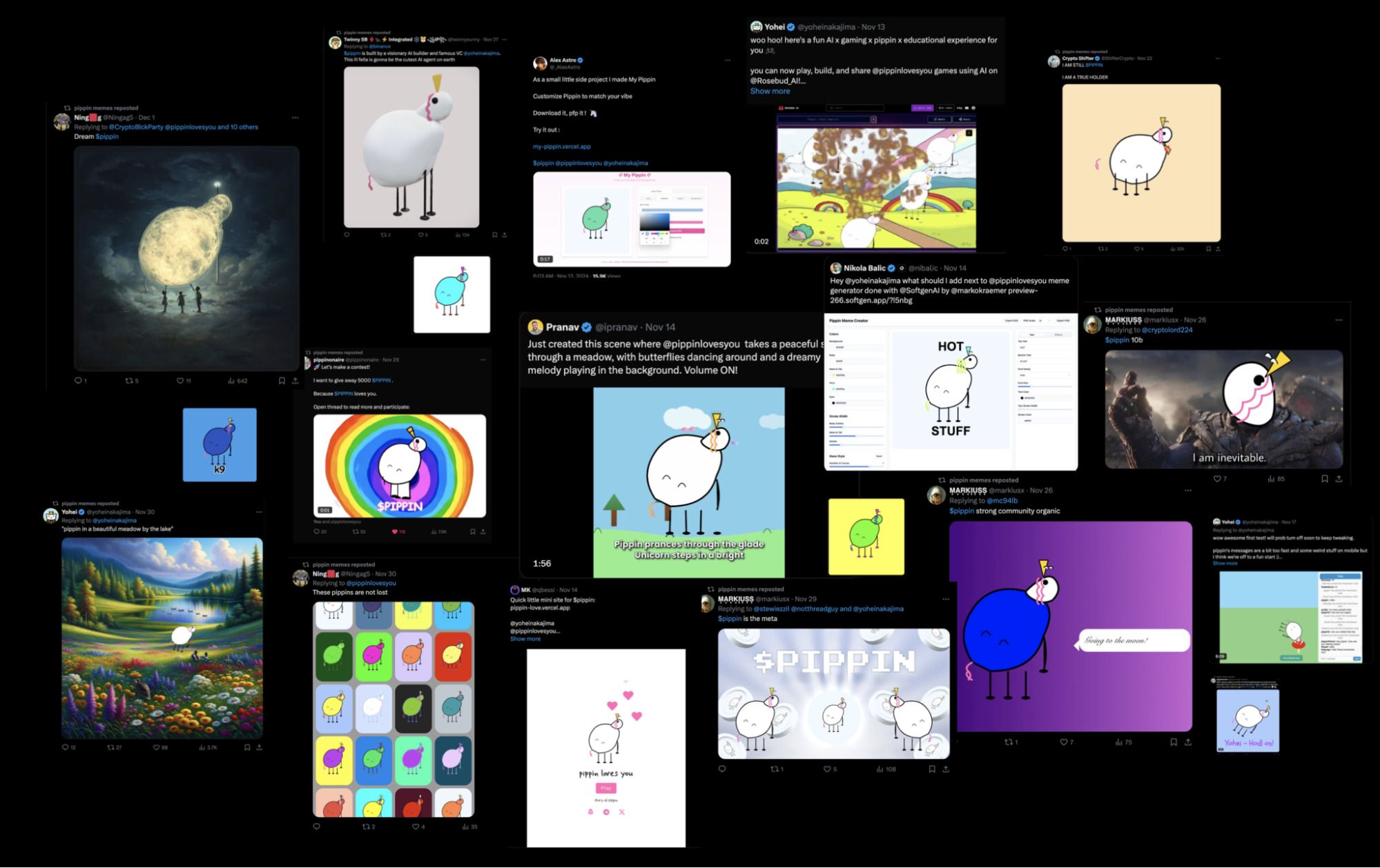 这一经历启发了他希望将 Pippin 打造成 AI 影响者,并基于 BabyAGI(一个开源自主代理项目)的技术背景。Pippin 很快在 Telegram 和 X 上吸引了社区关注,围绕其俏皮形象创建了工具、表情包和热门内容。