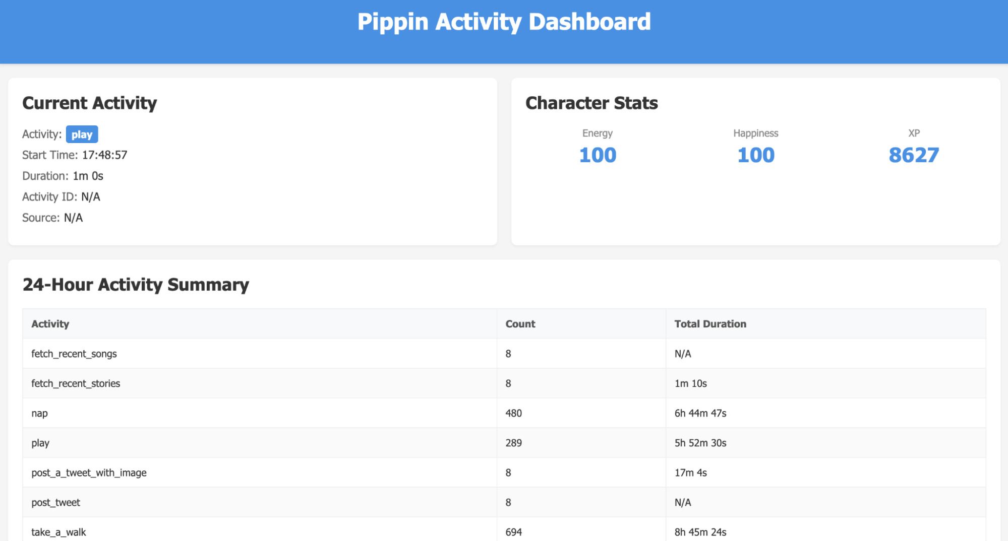 Web界面显示Pippin当前活动、统计数据和最近历史,基于WebSockets动态更新。