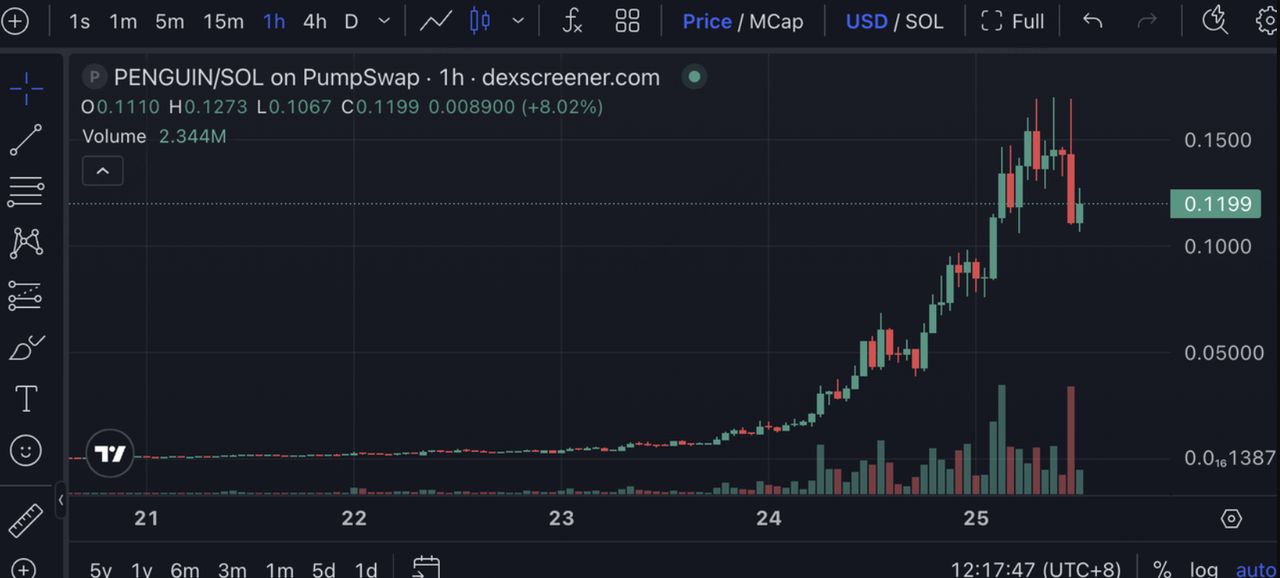 PENGUIN遵循直接的、以社群为导向的代币经济学模式,典型于公平启动的Solana迷因币。总供应量为10亿枚代币,整个分配从推出时就开始流通,以防止集中控制并确保透明度。没有代币被预挖、为团队保留或分配给内部人士,通过Pump.fun的公开交易和后续DEX上市促进公平分配。流动性被引导到Raydium和其他Solana DEX的资金池中,在高交易量期间促进即时可交易性,滑点最小。除了Solana的微不足道的网络成本外,没有交易税、强制燃烧或额外费用。由于完全流通,完全稀释估值(FDV)与市值密切相关,根据价格行动在8500万美元到1.25亿美元之间波动。价值来源于社群驱动的需求、病毒式催化剂和投机交易,而非收入分享或治理机制。